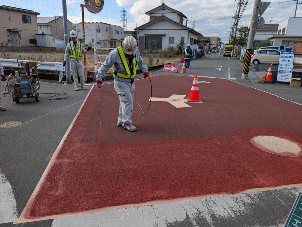 今回は交差点の薄層カラー舗装の施工の様子をご紹介します🤗
